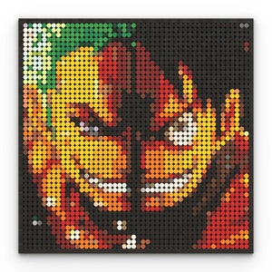 Dans cette composition unique, Luffy (côté droit) et Zoro (côté gauche) sont fidèlement représentés avec leurs expressions de combat iconiques. Luffy, avec son sourire narquois et son regard déterminé, tandis que Zoro, avec ses cheveux verts caractéristiques et son air sérieux, incarne la force et la loyauté. Chaque brique s’imbrique pour offrir un rendu saisissant, digne du trait unique d’Eiichiro Oda.